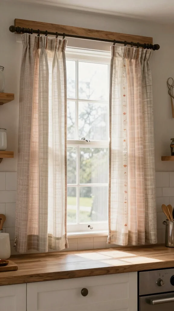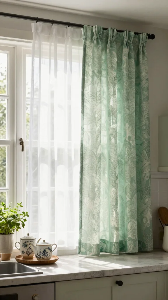 Layered window treatments beautifully frame your kitchen view while fostering a cozy ambiance.