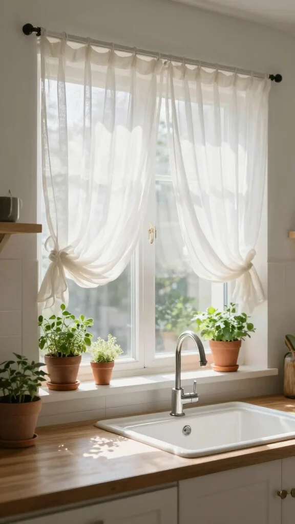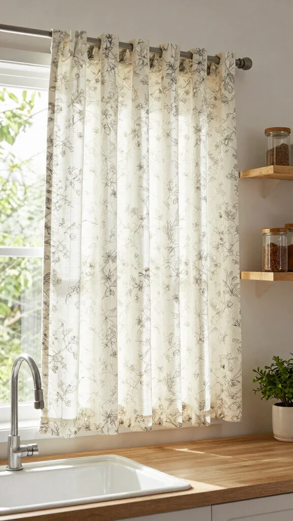 Sheer voile panels elegantly enhance your kitchen without overwhelming the space. These lightweight curtains gently filter natural light, creating a bright and airy feel that’s ideal for smaller kitchens. Made from natural or recycled fibers, they effortlessly blend style with sustainability.