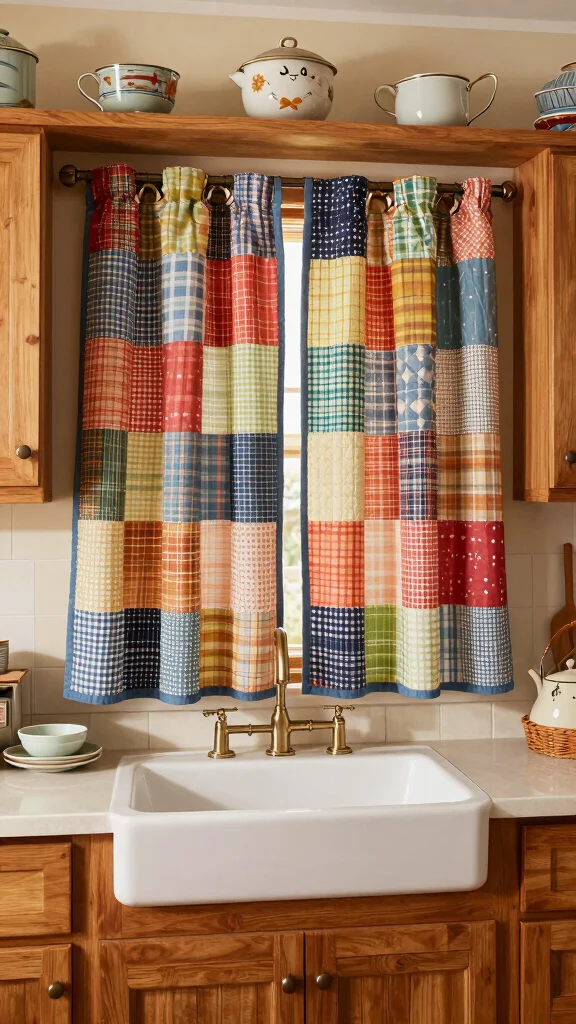 Patchwork quilt curtains provide a cozy, personalized touch to your kitchen. Made from leftover fabric scraps, these curtains emphasize sustainability through upcycling while offering unique patterns and textures. Their diverse designs create an inviting atmosphere that feels warm and homey.