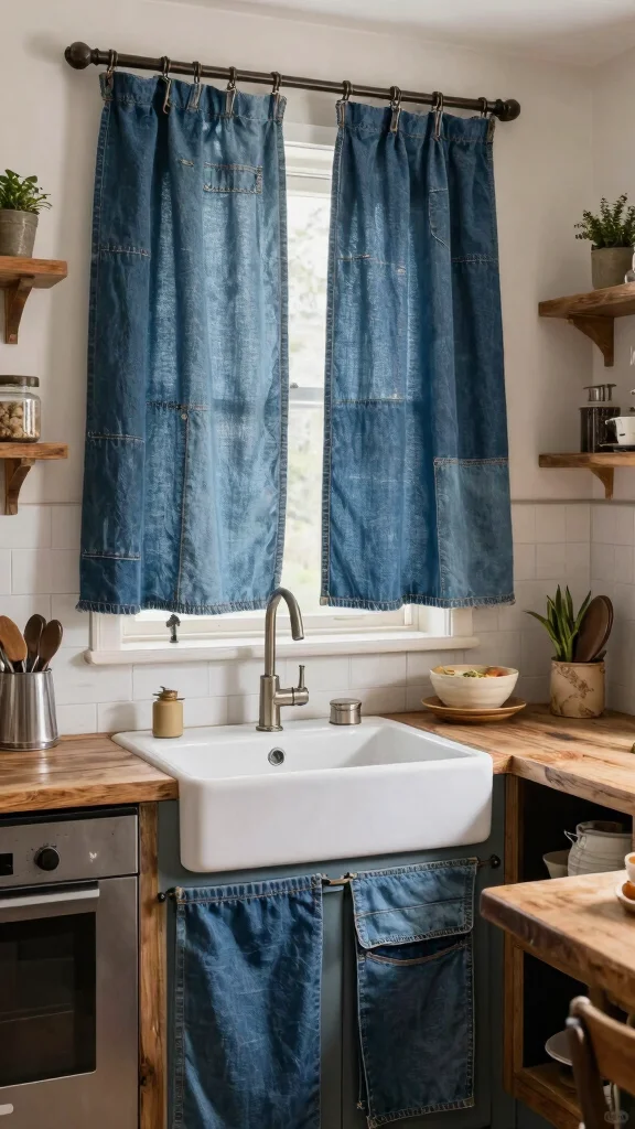 Upcycled denim curtains present a playful and innovative way to embrace sustainability in your kitchen decor. Constructed from old jeans and denim scraps, these curtains offer a quirky touch while promoting eco-friendliness. Their varying shades of blue and textures create a relaxed, casual vibe that fits well in any space.