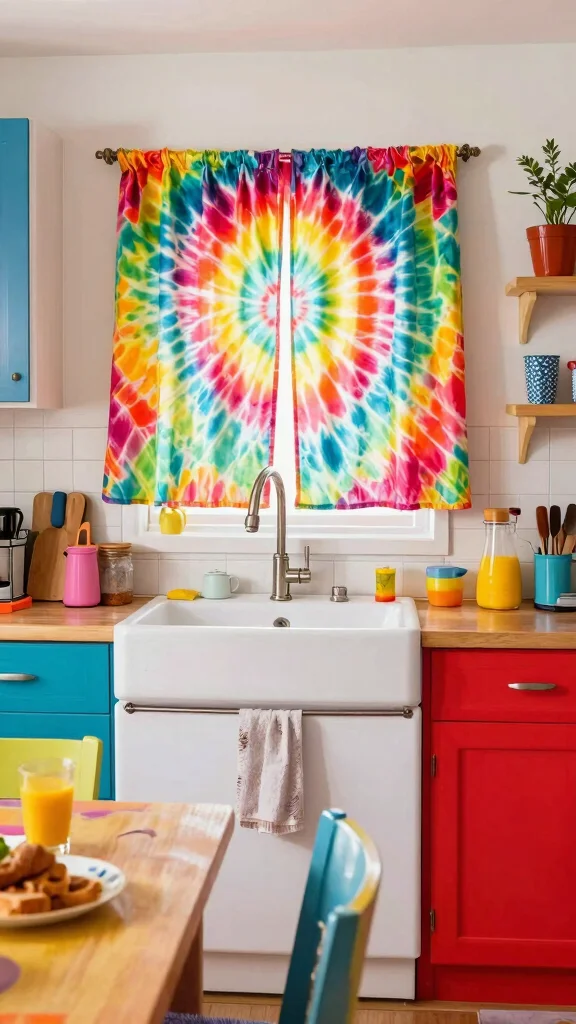 Colorful tie-dye curtains inject a vibrant burst of personality into your kitchen. Crafted from organic cotton or eco-friendly fabrics, these curtains add a playful touch to your sink area. The vibrant colors uplift the mood, creating a fun backdrop for your culinary activities.
