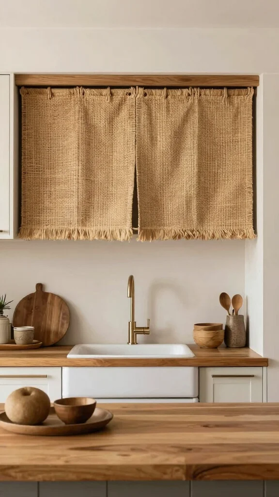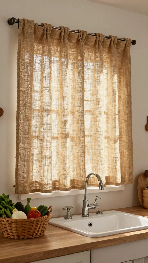 Jute curtains introduce a rustic, earthy charm to your kitchen. Made from natural fibers, jute is biodegradable and a great alternative to synthetic options. Their coarse texture provides a warm, inviting feel that perfectly suits country-style kitchens.