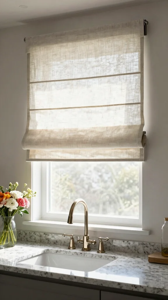 Linen Roman shades introduce softness and elegance to your kitchen, providing a timeless appeal that suits various styles. Their eco-friendly nature makes linen an ideal choice for those looking to combine sophistication with sustainability. Available in a spectrum of colors and textures, these shades allow you to create a tranquil cooking environment.