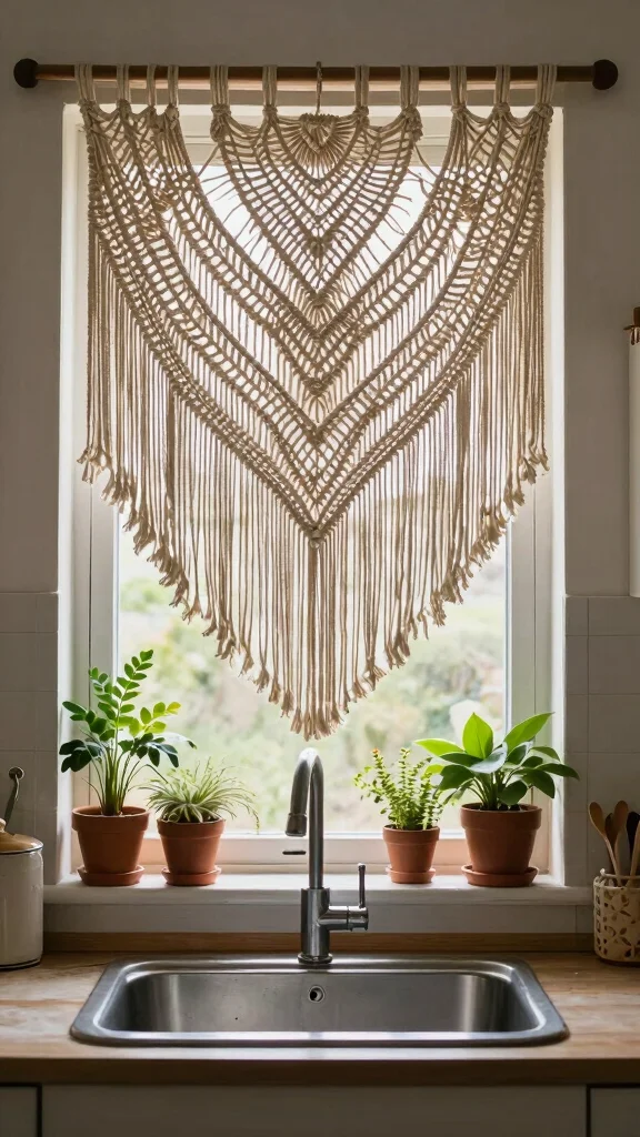 Macramé curtains effortlessly infuse a bohemian vibe into your kitchen. Crafted from cotton or jute, these hand-knotted designs filter light gently while adding texture and visual interest to your sink area. Depending on the thickness of the knots, these curtains can provide a semi-opaque barrier that still allows light to shine through.