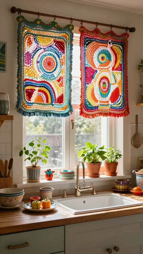 Colorful crochet curtains add a handcrafted touch to your kitchen, infusing it with warmth and texture. Lightweight and airy, they are perfect for creating an inviting atmosphere while showcasing artisanal craftsmanship.
