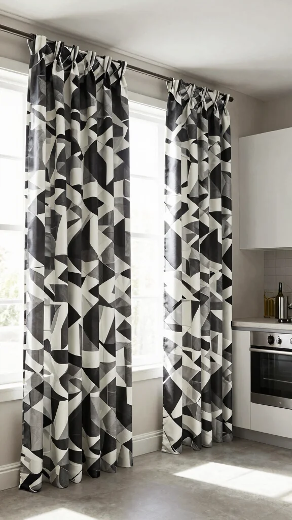 Geometric patterned curtains offer a striking visual impact in your kitchen, adding a contemporary and stylish touch. These patterns range from simple lines to intricate shapes, making them a perfect choice for modern decor.