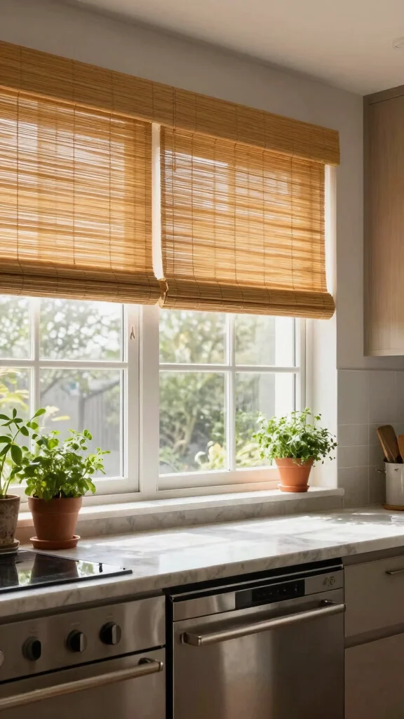 Using bamboo shades not only adds charm but also enhances your kitchen’s overall vibe, maintaining a perfect balance of light and privacy.