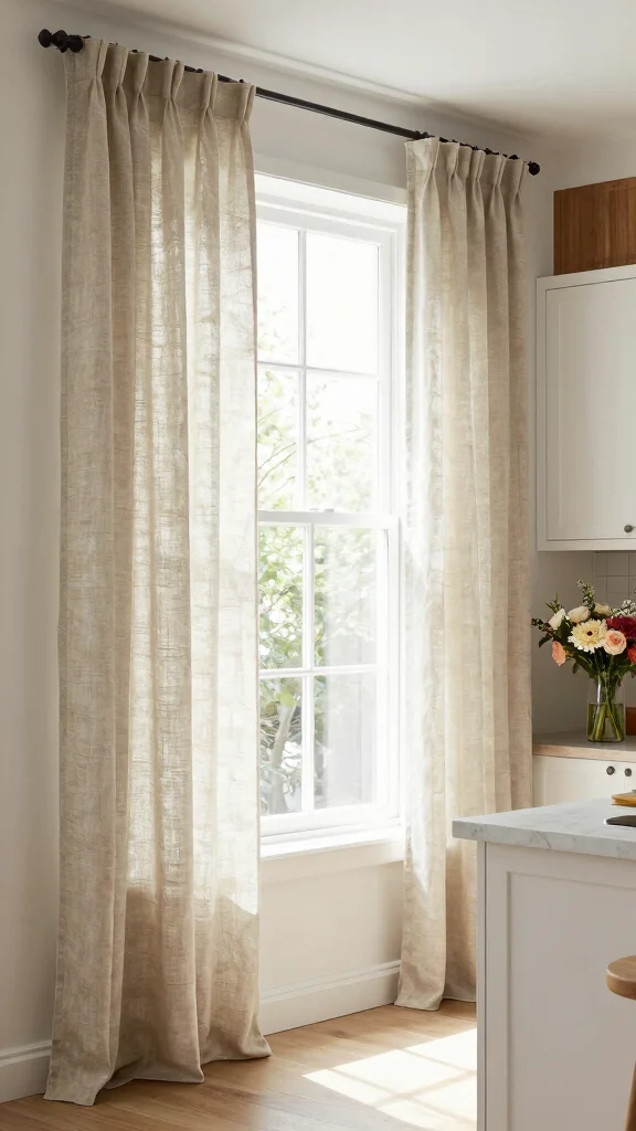 Choosing the right large kitchen window curtains can keep your space bright and airy. Start with light-filtering fabrics like sheer linen or cotton blends in white or soft neutrals to maximize natural light.