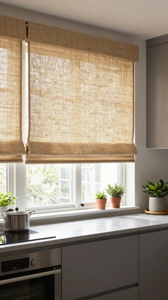 Natural fiber roller shades provide a sleek and modern aesthetic to your kitchen. Made from materials like jute or hemp, these shades are stylish and eco-friendly, offering a clean look that is both functional and attractive.