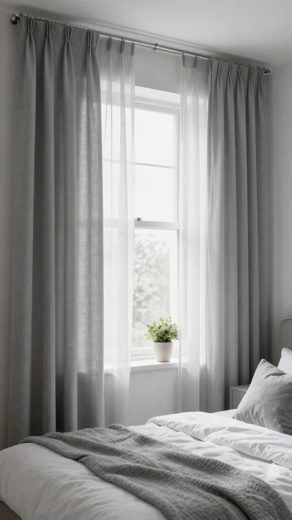 Layering light grey curtains can transform your bedroom into a serene sanctuary. The combination of sheer light grey fabrics with heavier drapes creates a soft, ethereal atmosphere that feels both inviting and calming. Imagine flowing sheer curtains framing your windows, allowing natural light to filter through while heavier drapes provide privacy when needed. This harmony of materials not only beautifies the space but also enhances its overall comfort and warmth.To make the most of this design choice, consider mixing fabric types and lengths. Budget-friendly sheer curtains can be easily found at local retailers or online stores. You might even explore thrift shops for unique drapes that can be layered with your heavier options, creating a custom look that suits your style.Consider these elements to maximize this palette’s potential: