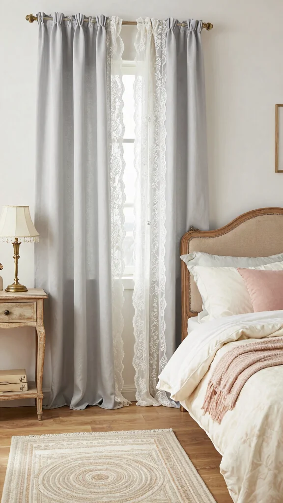 For a whimsical touch, light grey curtains with lace accents can add a romantic vintage charm to your bedroom. This style seamlessly blends classic and contemporary elements, making it a delightful focal point. Picture delicate lace details softening the overall appearance of your curtains, inviting warmth and nostalgia.To achieve this look, search for curtains adorned with lace trim that enhances the romantic vibe. Pairing them with vintage furniture pieces or decor items will create a cohesive aesthetic. Using soft colors in bedding will further enhance the inviting atmosphere.Here are some tips for achieving this charming design: