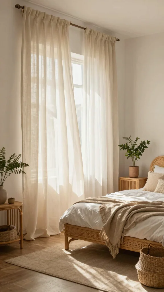 Combining sheer curtains with rattan accents creates a harmonious, nature-inspired atmosphere in your bedroom. Rattan pieces, whether furniture or decor, add a rustic yet chic element that complements soft, flowing sheers beautifully. Envision light-colored rattan side tables paired with gentle, airy curtains, enhancing the organic feel of the space and evoking a connection to nature.