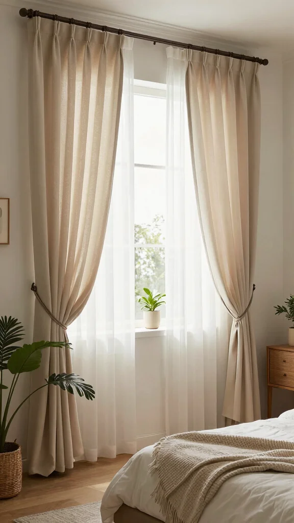 Layering step-by-step: choose a sheer curtain in a complementary color, pick a heavier drape in a matching tone, and ensure both have enough width to create fullness. Aim for about 2x the rod width so the stack looks lush. Install a track or rod that allows easy opening, and consider a blackout lining behind the sheers for night privacy while keeping the soft look. Add tiebacks or boho accents to keep layers tidy when open. This approach keeps your bedroom decor cohesive while letting you control light with ease.