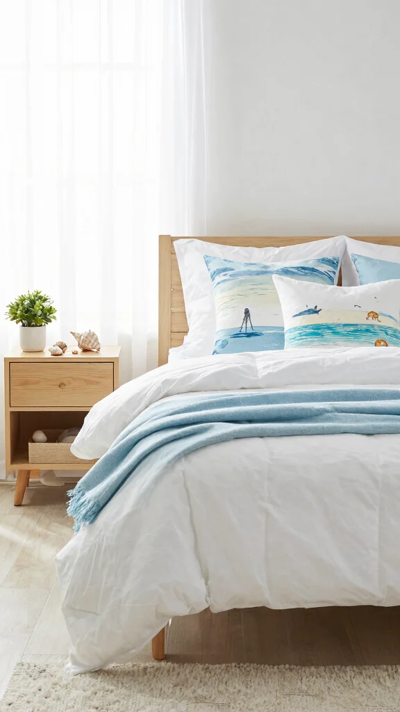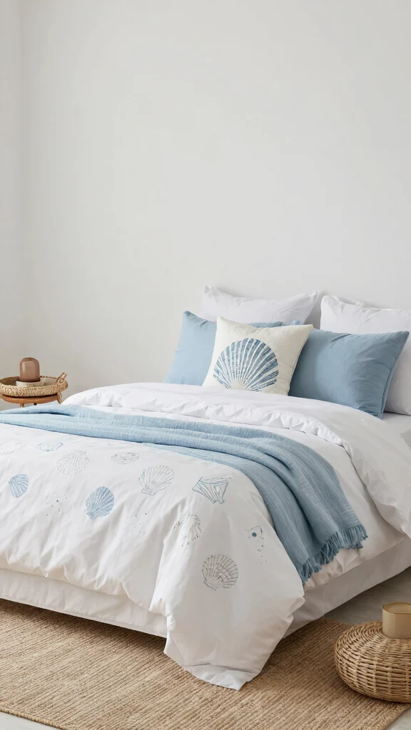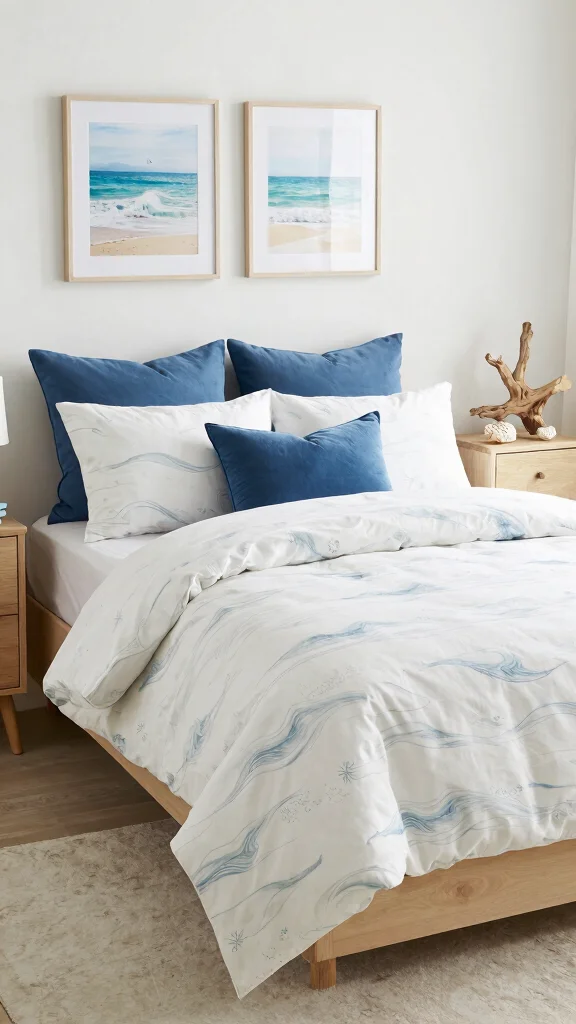 White bedding sets featuring ocean-inspired patterns can add a playful yet elegant touch to your bedroom. Think about subtle prints like waves or coral that evoke a sense of the beach. When these patterns are paired with solid blue accent pillows, they create a refreshing contrast that grounds the overall theme.