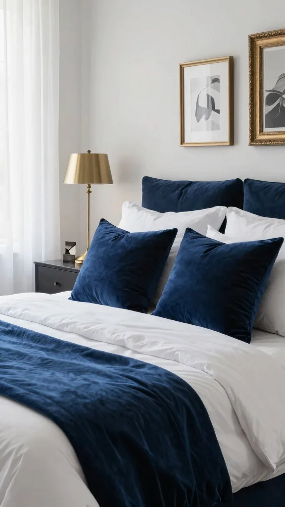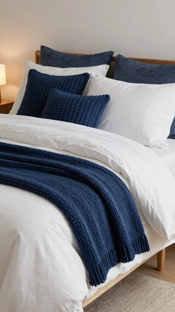 Consider adding a navy throw blanket at the foot of the bed for extra comfort and to enhance the color scheme. This look pairs beautifully with light wood or white furniture, making it an excellent choice for a modern decor style.