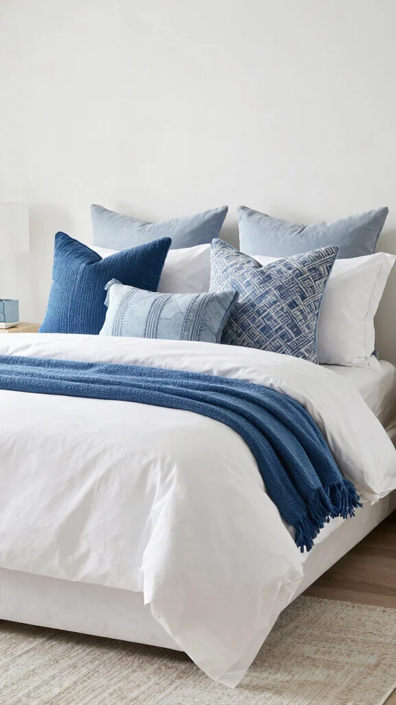 Blue comes in many shades, from soft sky blue to deep navy. Think about the mood you want to create. Lighter shades can evoke a calming atmosphere, while darker blues can add depth and richness. Experiment with swatches to see how the colors look against your walls and other decor. Make sure the blue accents contrast well against your white bedding for a sharp look.