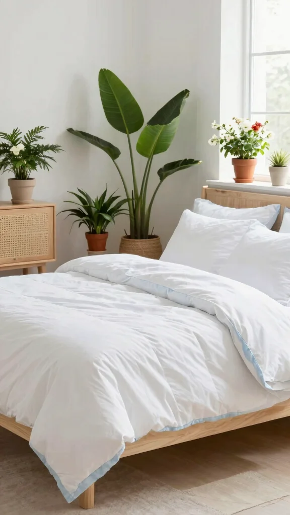 Pair white bedding with light blue accents and greenery for a refreshing, natural feel in your bedroom.