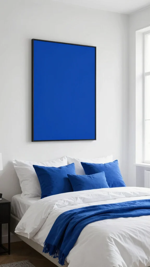 For a statement-making design, consider bold blue artwork in your bedroom while keeping the bedding simple and white. This strategy allows the art to shine as the focal point while maintaining an elegant look. Pair the artwork with simple blue throw pillows that reflect the colors in the art piece, creating visual harmony.