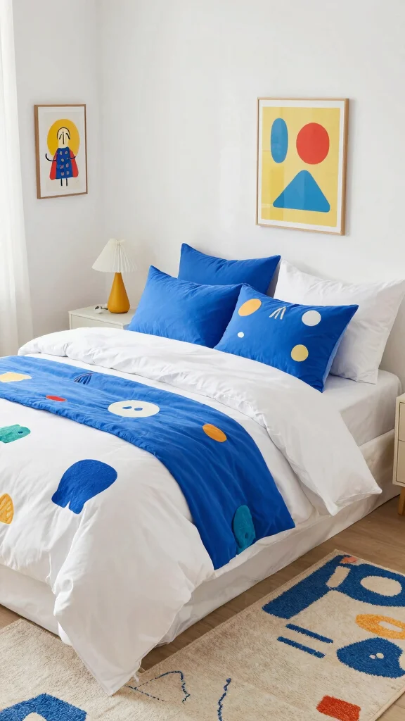 Create a whimsical atmosphere by choosing bright blue accents against white bedding. Utilize fun shapes and patterns in your accent pieces, like starry pillows or cloud-themed throws, to add a playful touch to your decor. This look is especially suited for kids’ rooms or playful adult spaces that embrace creativity.
