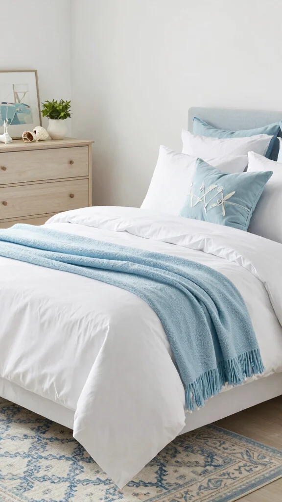 Choose coastal-inspired white bedding paired with soft blue accents for an ultimate beachy vibe. Think light, breathable fabrics that evoke the feel of sand and sea breezes. Incorporate soft blue decorative elements, like seashell prints or ocean-themed accents, to complete the look.