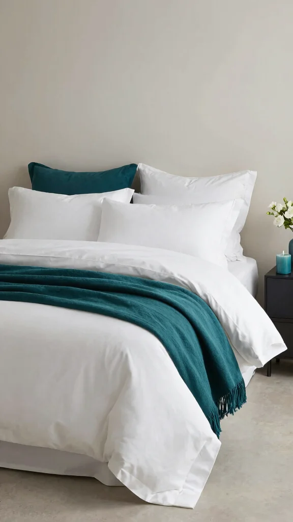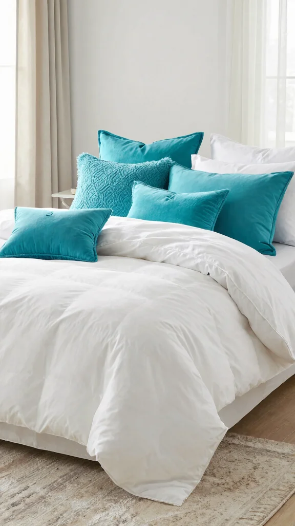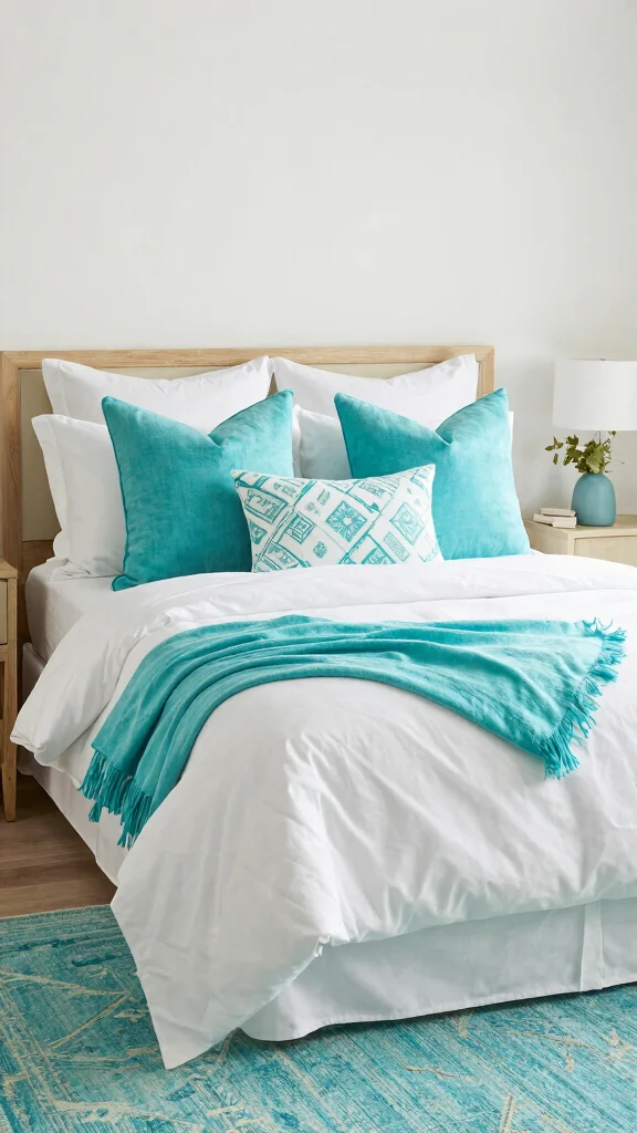 Turquoise throw pillows can breathe life into serene white bedding, infusing it with vibrant color. This lively combination is perfect for creating a cheerful, relaxed vibe in your bedroom. Look for patterned pillows that incorporate various shades of blue for a cohesive look.
