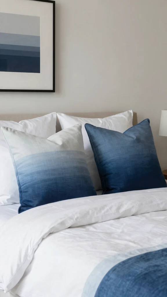 White linen bedding with blue gradient accents brings a calm, coastal vibe you can feel. Layer pillows in varying blue tones to add depth, turning your bed into a serene focal point. Pair with a dark blue velvet throw and simple wall art to tie it together.