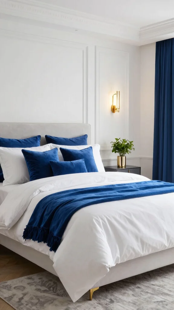 For a minimalist aesthetic, consider using simple white bedding with bold royal blue accents. This striking color adds a modern touch without overwhelming the space. Think about integrating royal blue sheets or a single accent pillow against a crisp white comforter for a sleek look.