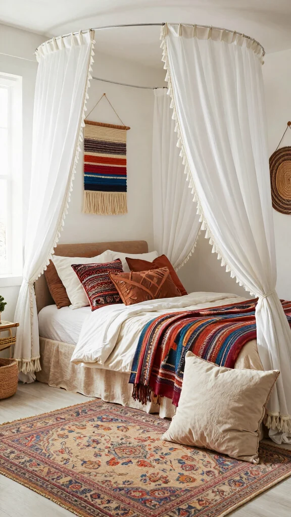 Bohemian-style decor complements white curtains beautifully, creating a relaxed and inviting atmosphere. Opt for flowing curtains with unique textures, such as crochet or fringe, to enhance the boho vibe. This style suits small bedrooms, adding character without feeling cluttered.