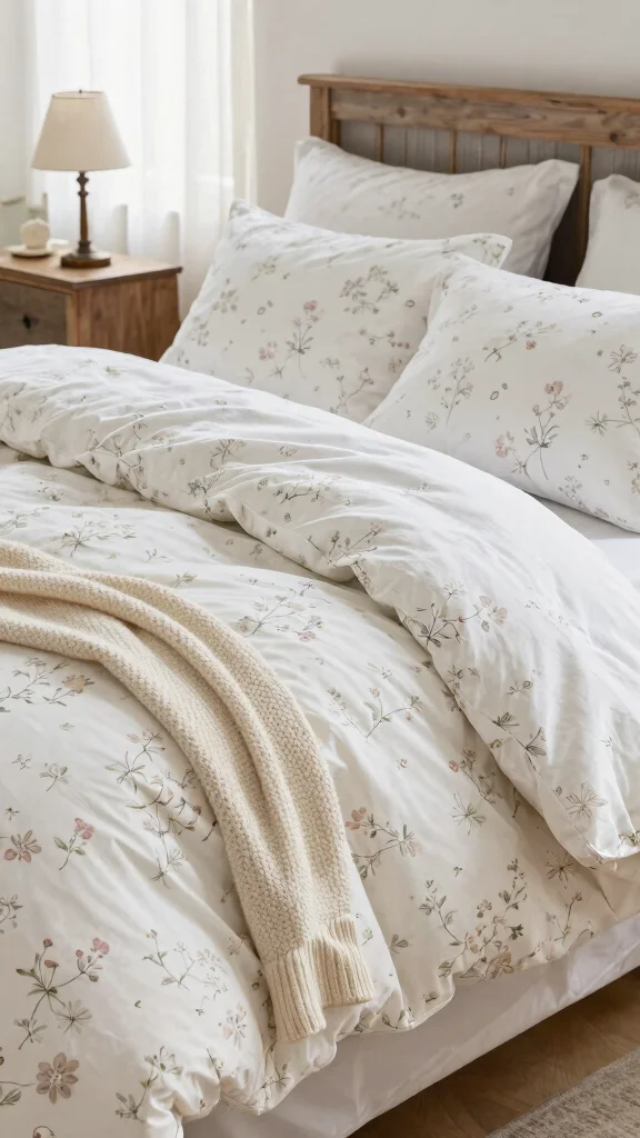 Create a serene canvas with white floral bedding as the star. Start with a clean white base and a soft cottage style bedding palette of cream, pale sage, and warm beige. Layer with textured accents like a chunky knit throw or linen blanket to add warmth. Choose a floral print duvet cover in a delicate, small-scale pattern to keep the room light. Add natural wood furniture and a touch of greenery to enhance the cottage vibe, then finish with a couple of floral throw pillows in coordinating shades for a cozy, romantic look.