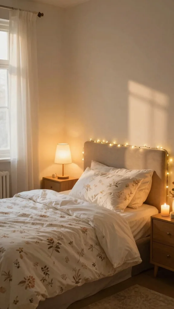 Soft lighting is key to creating the perfect atmosphere in your cottage-style bedroom, enhancing the charm of your white floral bedding. Consider bedside lamps with warm light bulbs, fairy lights along the headboard, or candles on a nightstand to create a cozy glow. Adjustable lighting and dimmers allow you to customize the ambiance, making it bright for daytime activities and softly lit for bedtime relaxation. Lighting serves not just a functional purpose; it can also be an artistic element in your decor.