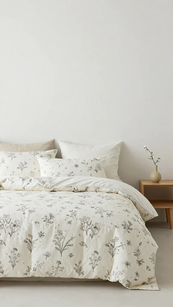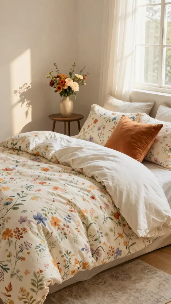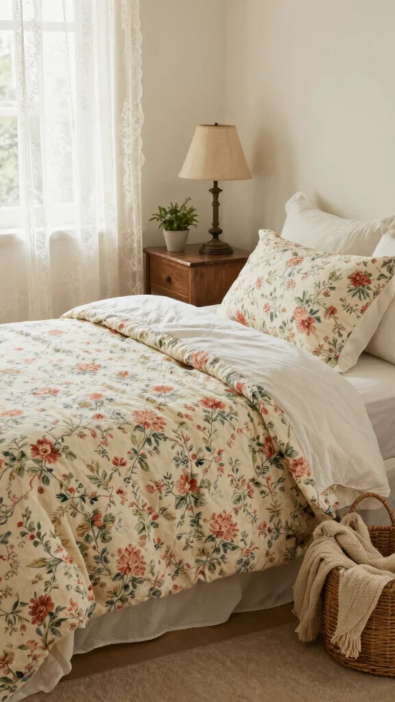 Look for delicate motifs in a soft, cohesive color palette. Choose floral print duvet covers in gentle ivory, blush, or sage that coordinate with white floral bedding and your cottage style bedding scheme. Opt for natural fabrics like 100% cotton or linen for a breathable, cozy feel, and pick a smaller or medium-scale print to avoid overpowering the room. Check care instructions and durability, and choose colors you can easily reuse with other pieces in your decor.