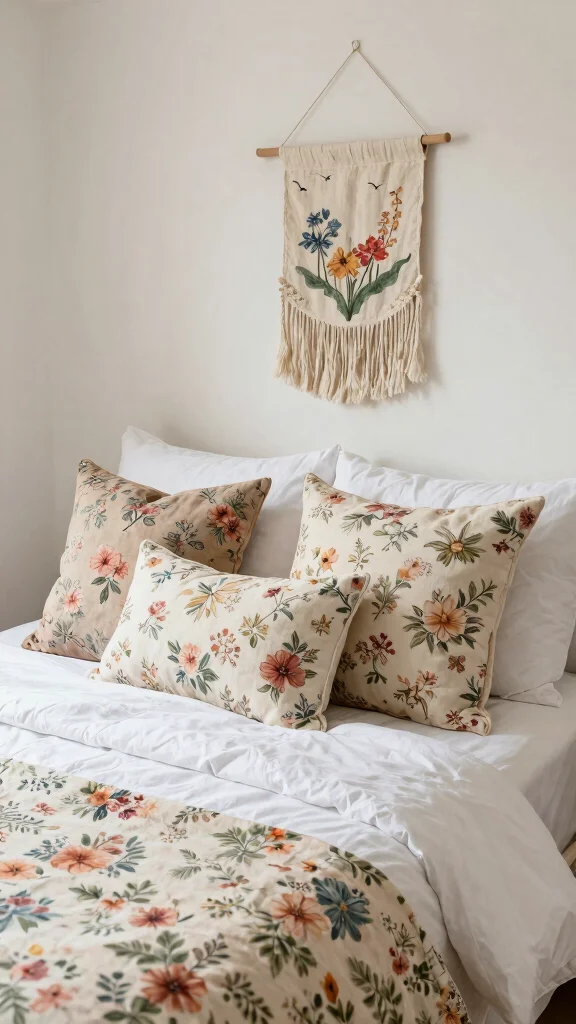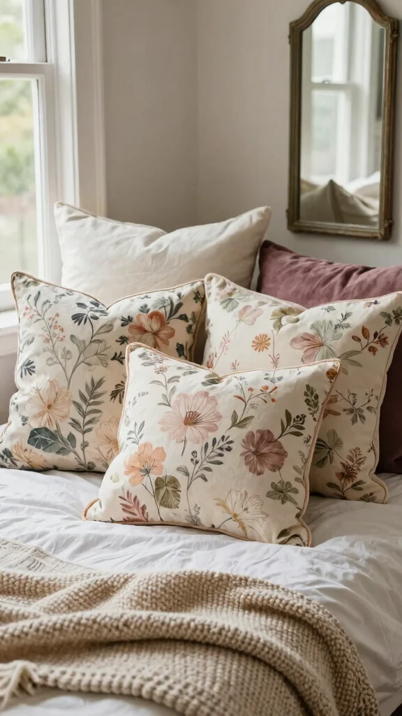 Start with a calm base, using a white bedding set as the foundation. Limit floral throw pillows to 2–3 and mix in solid neutrals or subtle textures to maintain balance. Vary pillow sizes and keep the color family cohesive so the florals feel intentional, not busy. Place the largest printed pillow toward the center and smaller accents around it, then let the rest of the room breathe with simple, cozy textures to achieve cozy bedroom decor without crowding the space.