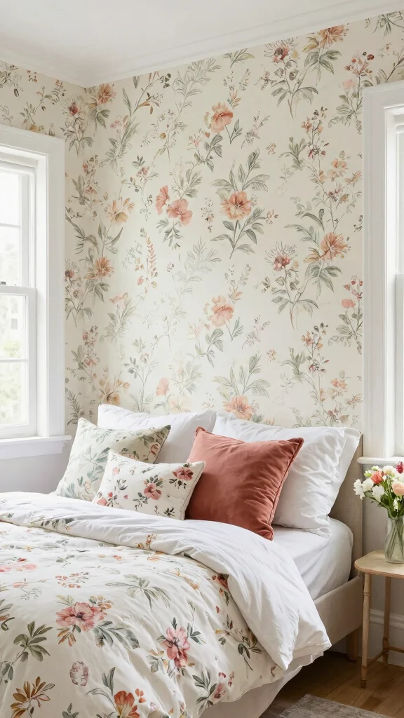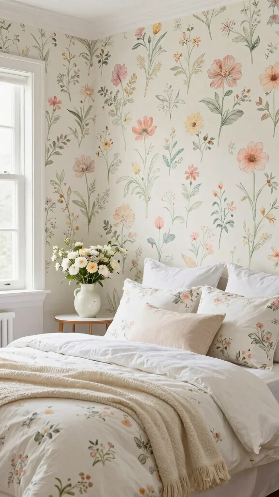Why limit florals to just your bedding when you can also adorn your walls? Whimsical floral wallpaper creates a stunning backdrop that beautifully enhances your floral bedding theme. Look for wallpapers with soft, contrasting colors that complement your bedding without overpowering it. This choice sets a cozy tone while adding character and interest to your space. Pairing white floral bedding with a soft wallpaper creates a cohesive cottage-style feel that exudes charm.