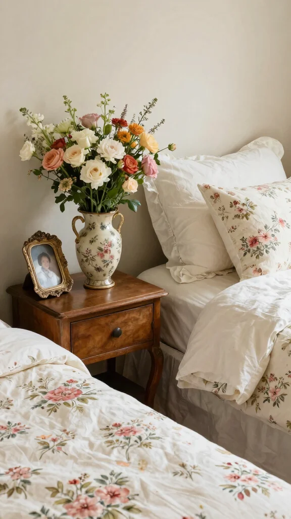 Incorporate vintage floral accessories into your decor to heighten the cottage charm of your space. Antique vases, vintage picture frames, and floral-covered footstools add character and history to your room. These accessories beautifully complement white floral bedding, creating a warm atmosphere filled with nostalgia. Mixing new and vintage pieces fosters a unique and timeless feel in your bedroom.
