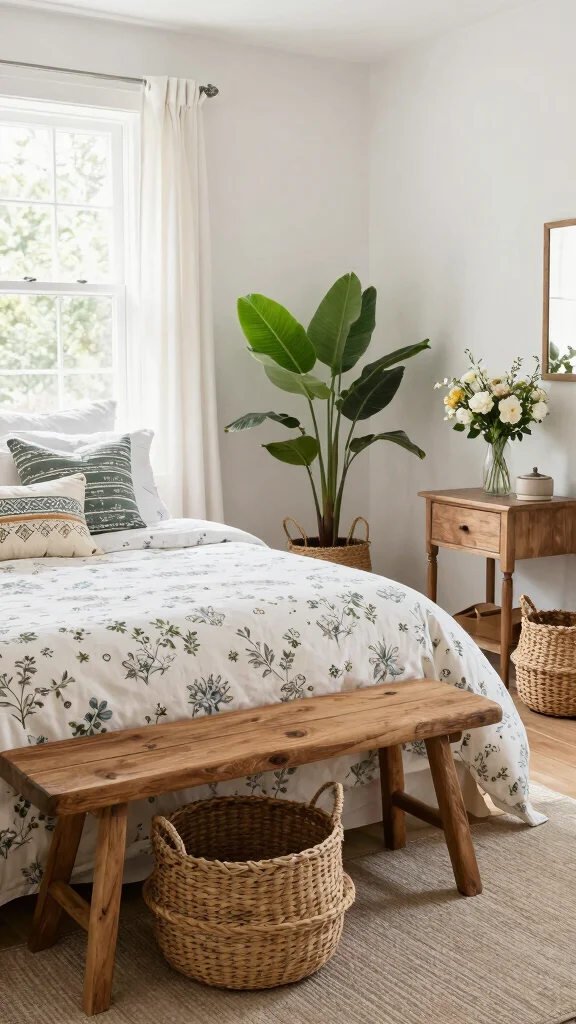 Use wicker or rattan baskets for stylish storage and decor. Add rustic wood furniture to tie everything together.