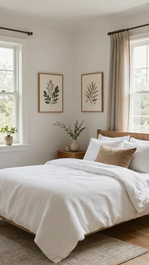 Select a wooden bed frame or nightstands to introduce a rustic touch. Potted plants or fresh flowers can add vibrant color and freshness, while jute or sisal rugs enhance the natural feel of your room.