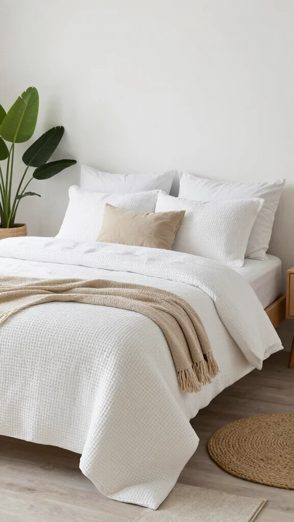 How can I layer white waffle bedding without losing the minimalist vibe?