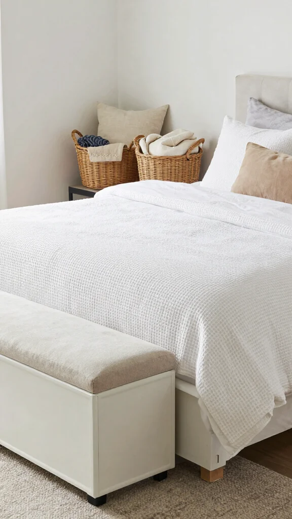 Utilize smart storage solutions to maintain the serenity of your space while enjoying white waffle bedding. Integrated storage helps keep your bedroom tidy and clutter-free, essential for a minimalist decor approach.