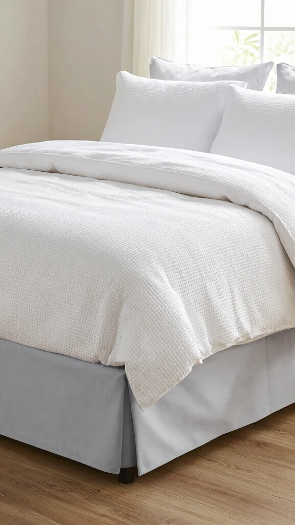 Elevate your white waffle bedding arrangement with a stylish bed skirt. This element adds texture and can be coordinated with your other bedding for an enhanced minimalist style. A well-chosen bed skirt provides a clean finish and allows for under-bed storage, keeping your space tidy.