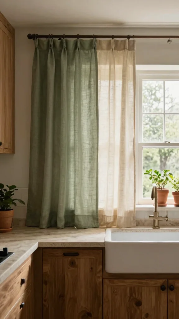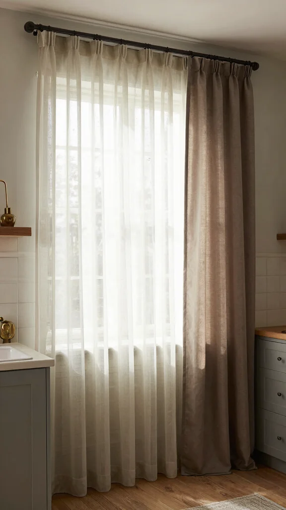A layered curtain look not only transforms your kitchen window into a stunning focal point but also allows for flexibility in controlling light and privacy, making your space more functional and aesthetically pleasing.
