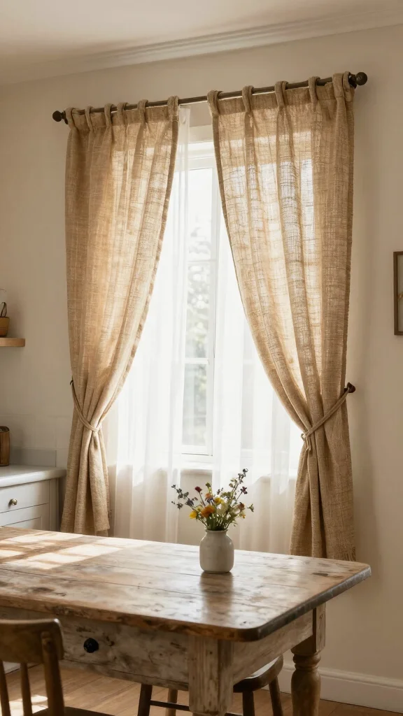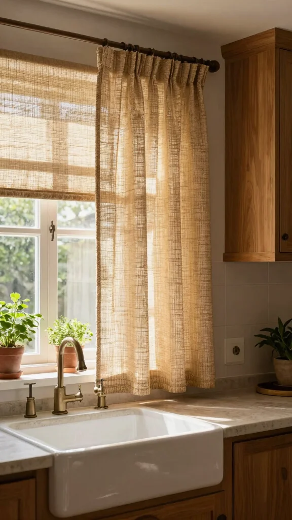 Rustic jute curtains bring an earthy, organic touch to your kitchen, perfect for those who appreciate natural materials. Made from sustainable jute fibers, they offer a textural element that softens the look of your windows while allowing warm light to filter through. Imagine their sturdy yet delicate appearance complementing your farmhouse decor beautifully.