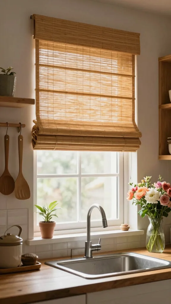– Use bamboo shades to match wooden cabinetry